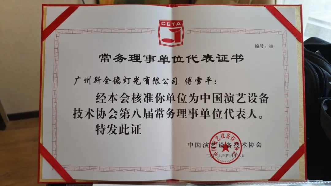 这是协会对斯全德 26 年深耕演艺灯光领域、积极参与行业建设、全力推动技术标准落地的高度认可与信任,更是公司在行业影响力、治理参与度、品牌公信力上的重要跃升。未来,斯全德将在傅雪平总经理的带领下,积极履行常务理事职责,为行业高质量发展贡献更大力量。